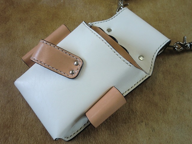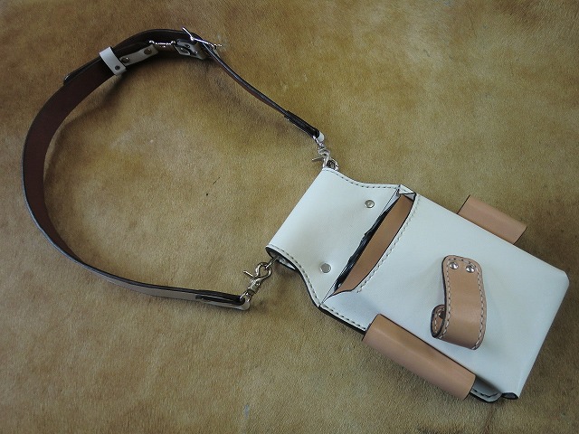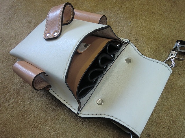 ▲白ぬヌメ革をベースに収納スペースや