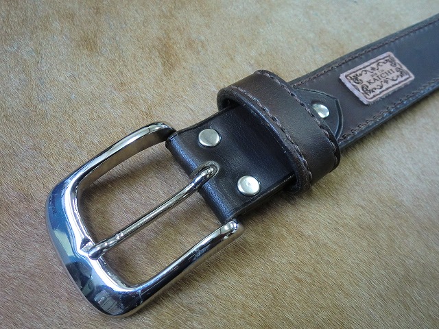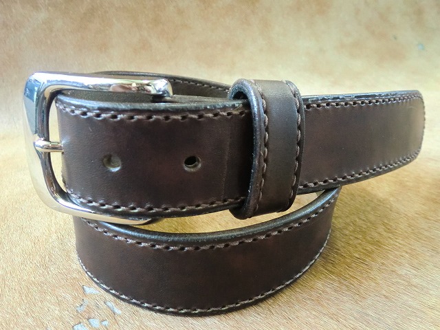 手染めで焦げ茶に染色を施したベルト革に