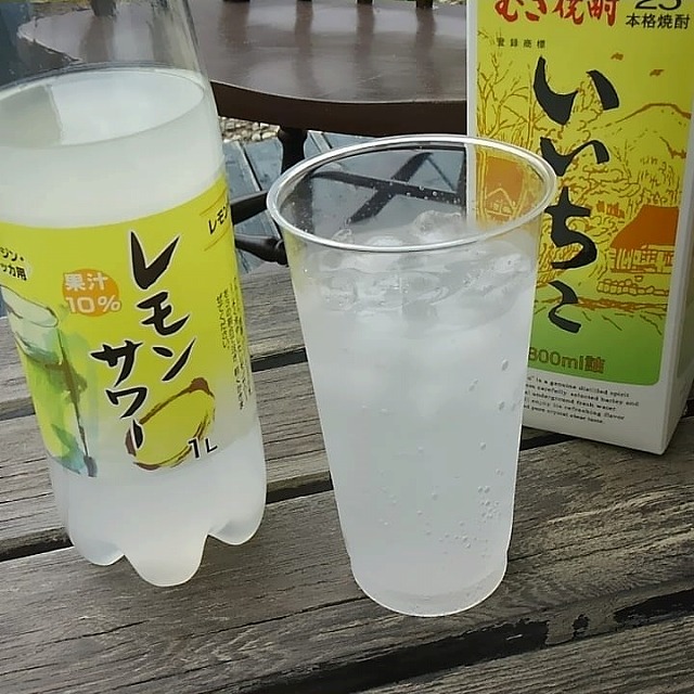 今日の晩酌は庭で下町ナポレオンのレモンサワー♪