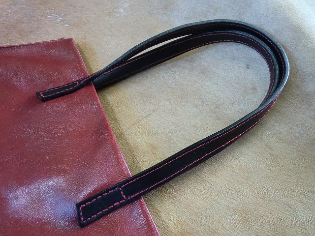▲持ち手を黒の革に赤のステッチで