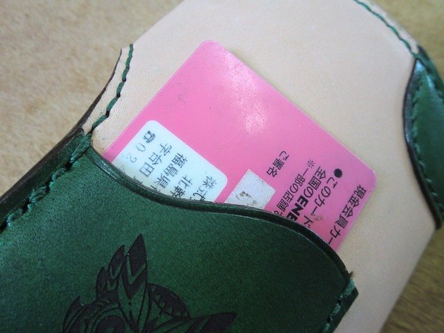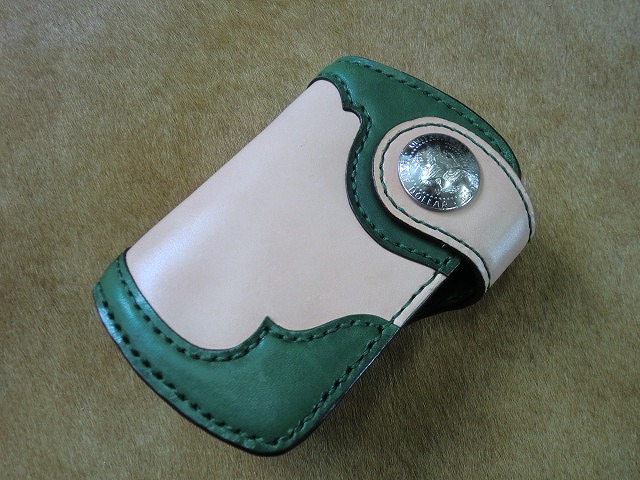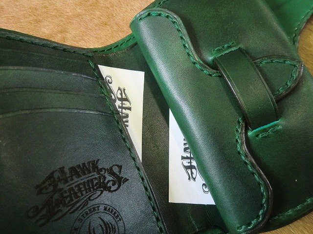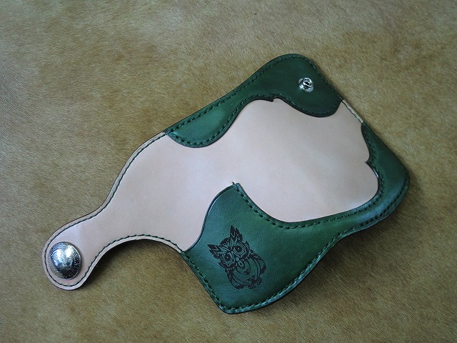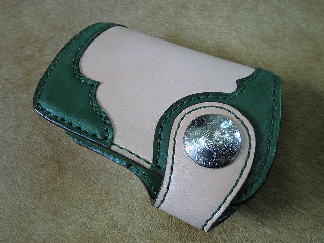▲ナチュラルカラーのサドルレザーに手染め緑に