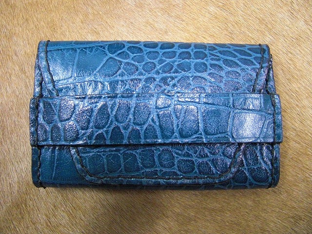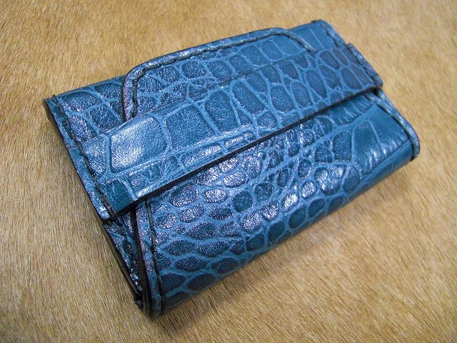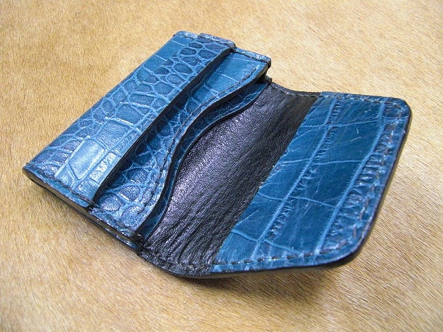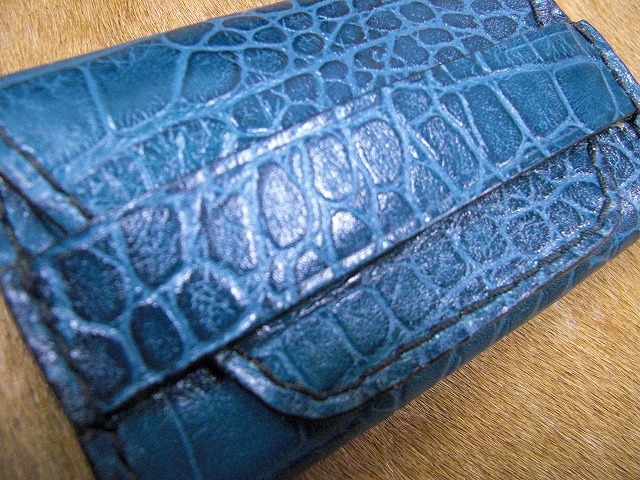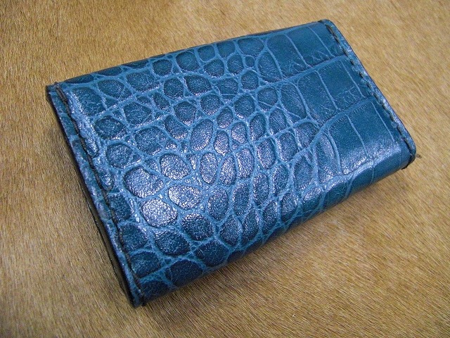 ワニ型押し革の名刺入れの青