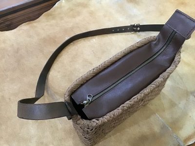 編んだカゴをショルダーバックに