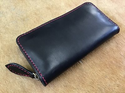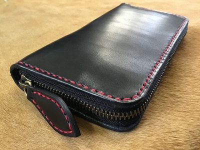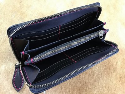 ラウンドファスナーロングウォレット黒/赤ステッチ