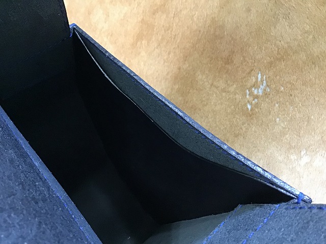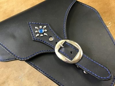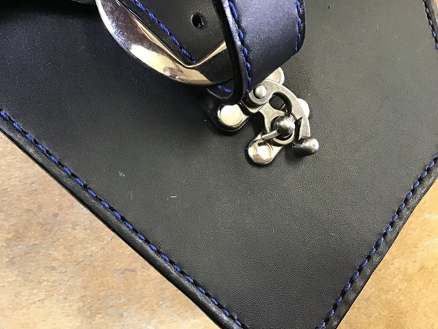 青のステッチで仕立て、ベルトの