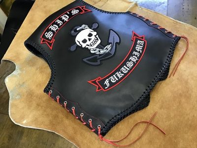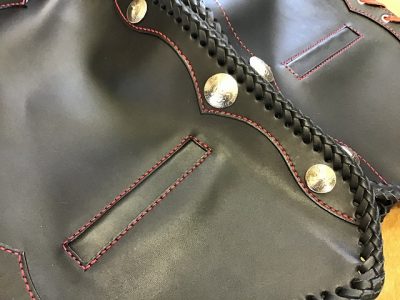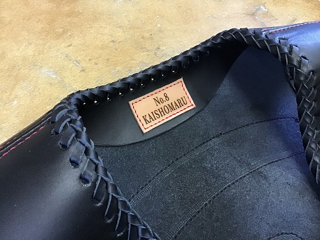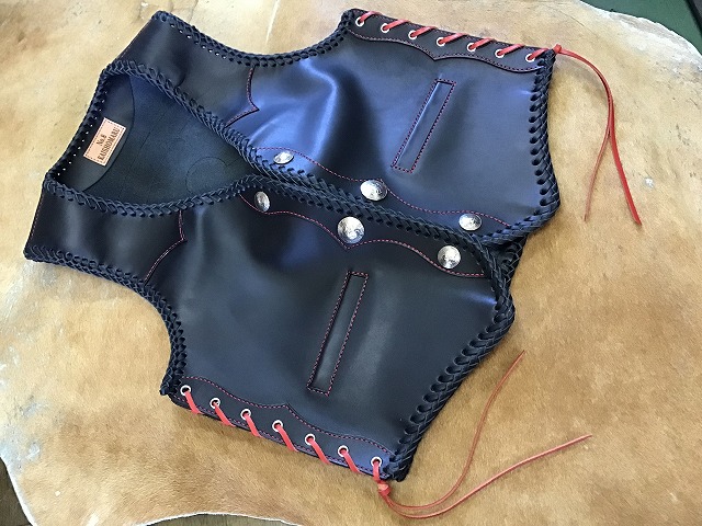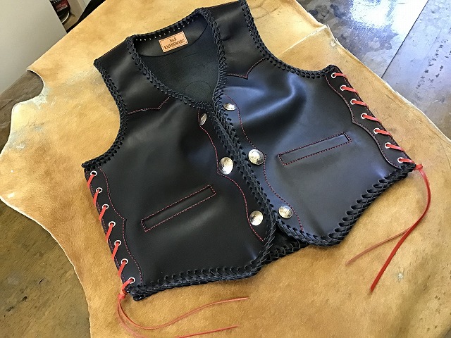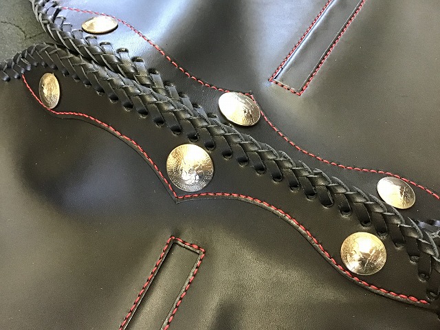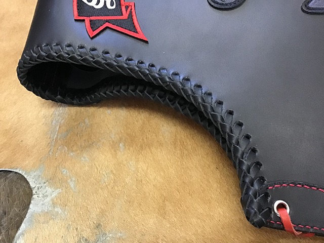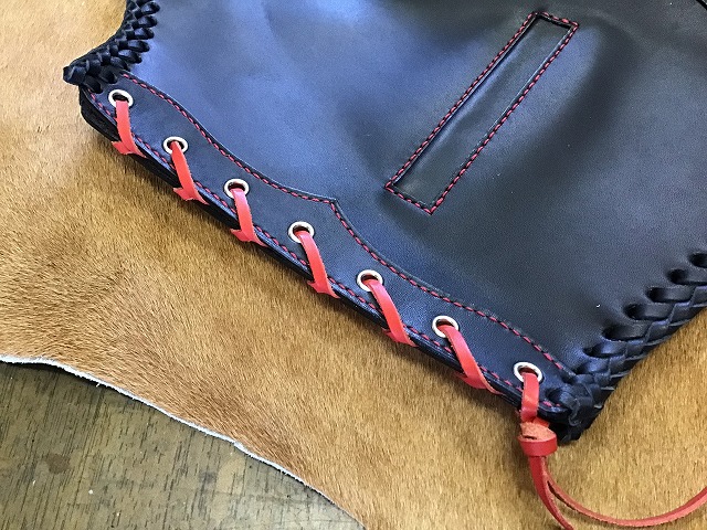赤の糸、サイドの編み込みに赤の牛革レースを