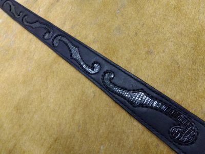 トカゲの革でインレイワークを手縫いで施し、