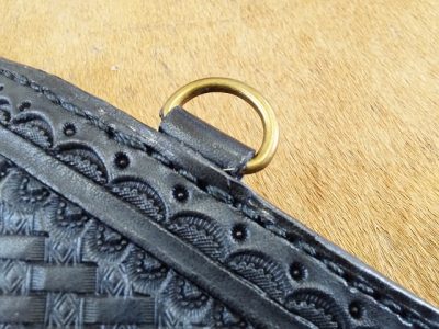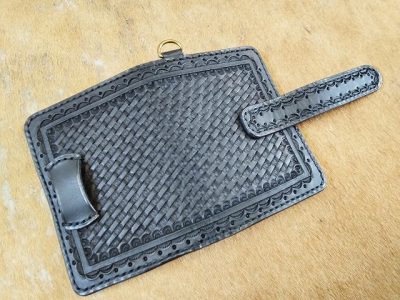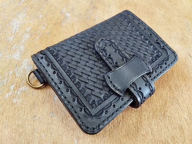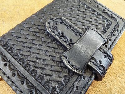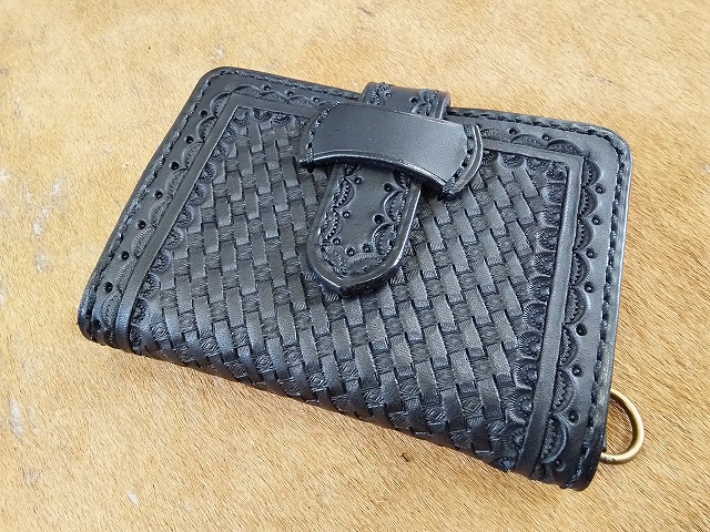 バスケット模様の刻印を打ち込み、手染めで黒に