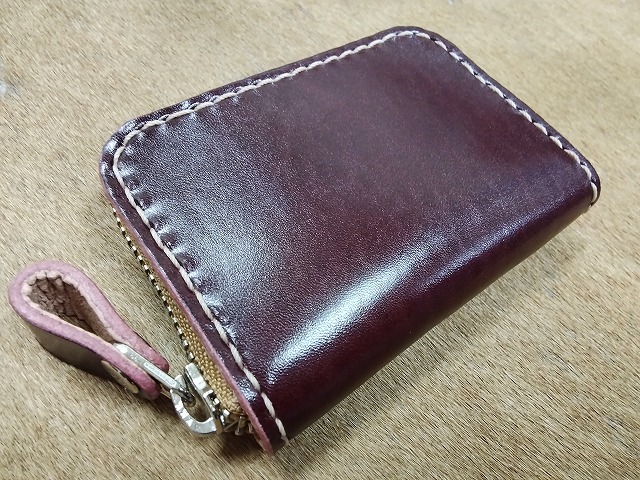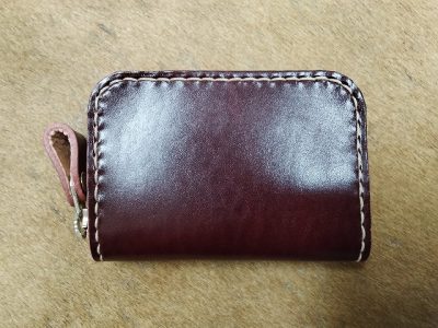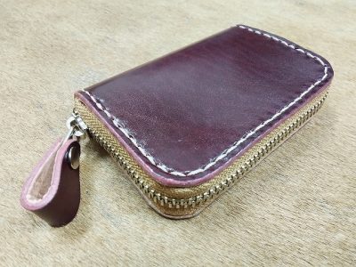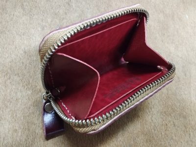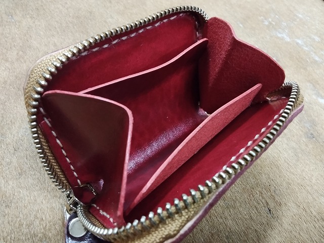 赤を使用して製作した、硬貨、カード類、三つ折りにした