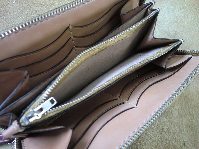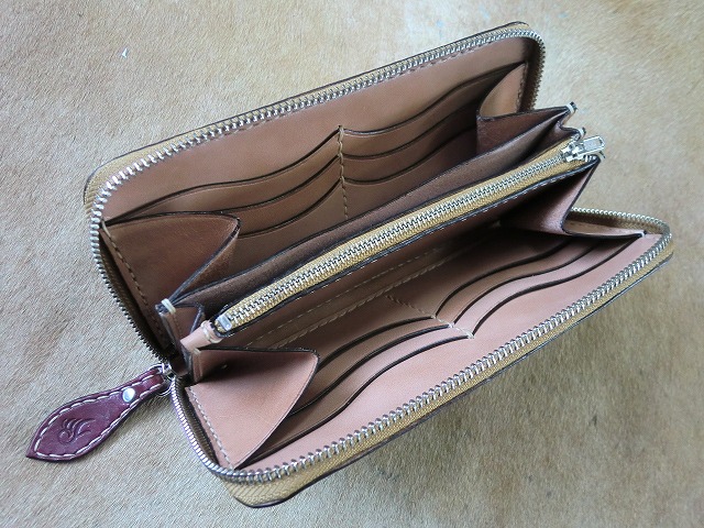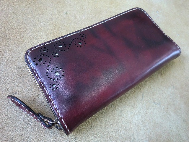 ラウンドジップロングウォレット手染め赤茶 唐草パンチング仕様