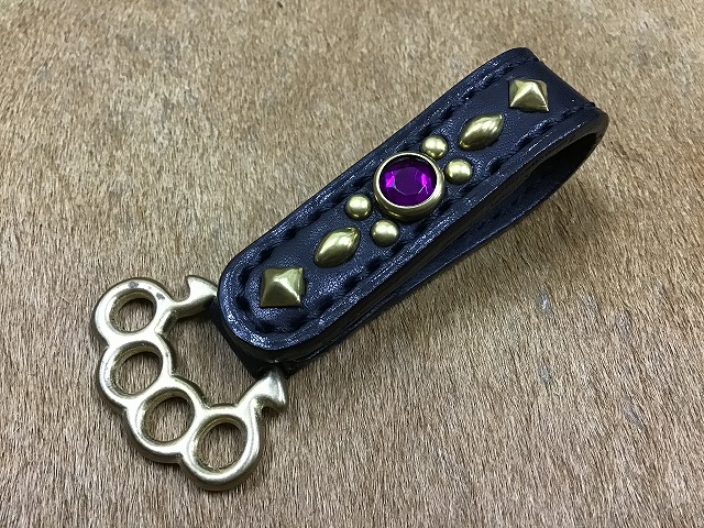 手染めで黒に染色を施したサドルレザーに、真鍮無垢のピラミッド、エキスプレス、ラウンド、紫のジュエルを組合せてスタッズワークを施し、ジョイント金具には、真鍮製のメリケンサックタイプを使用して製作したベルトループホルダーです。