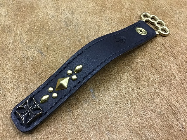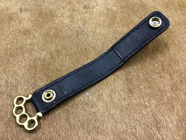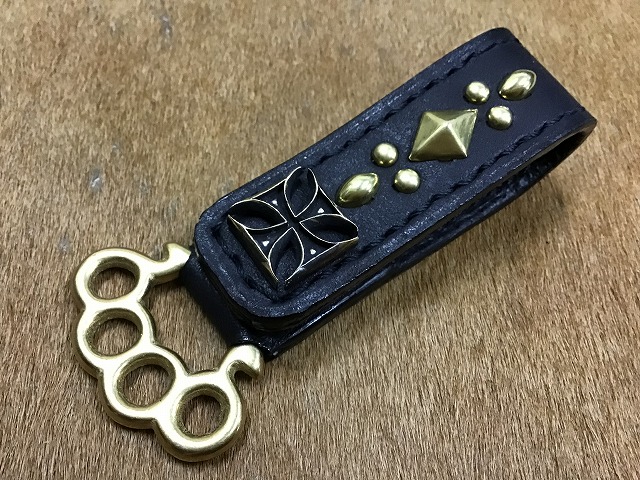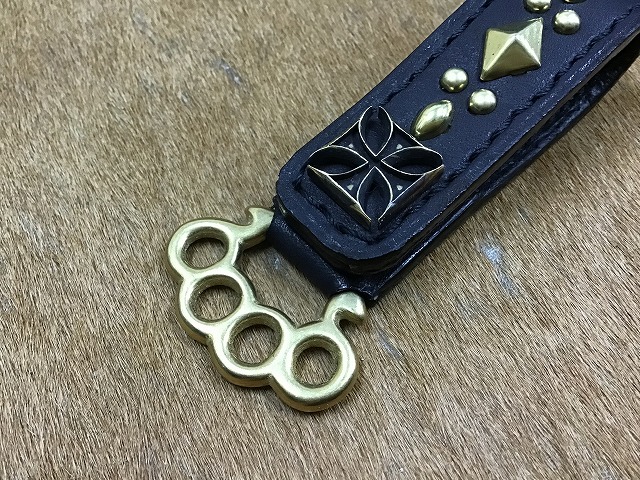 黒にオイルレザーに、真鍮製のアイアンクロススタッズをメインにスタッズワークを施し、ジョイント金具には、真鍮製のメリケンサックタイプを使用して製作したベルトループホルダーです。