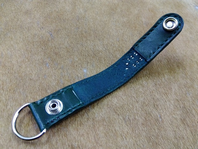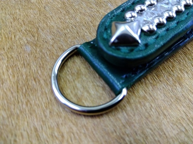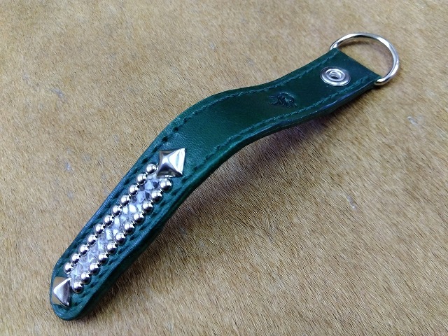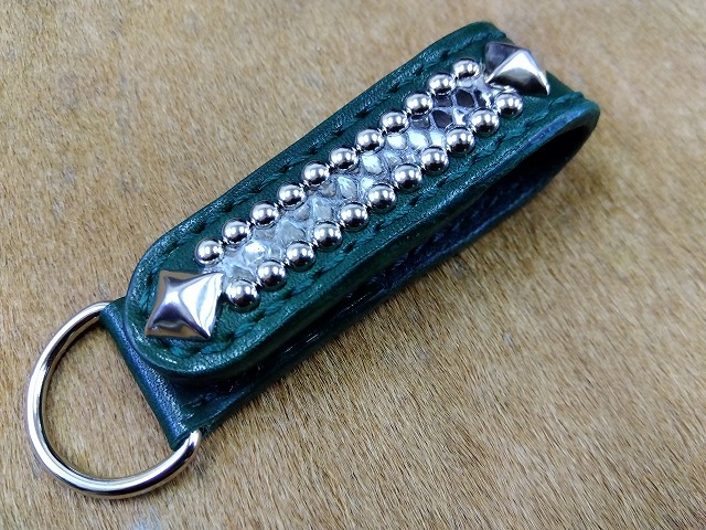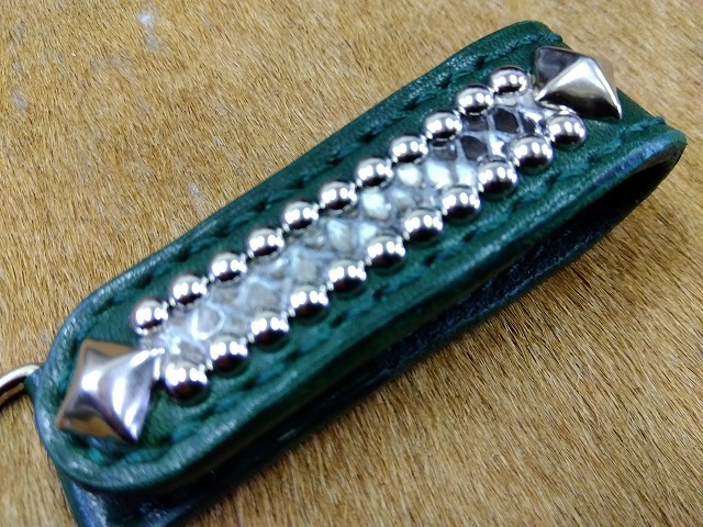 手染めで緑に染色を施したサドルレザーに、ダイヤモンドパイソンを真鍮製ニッケルメッキ仕上げの、ピラミットスタッズとラウンドスタッズを使用したスタッズワークでインレイを施し製作したベルトループホルダーです。
