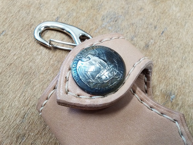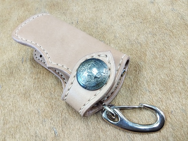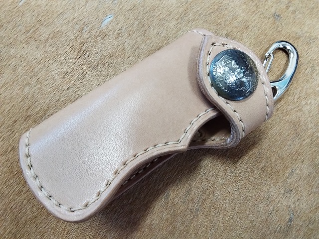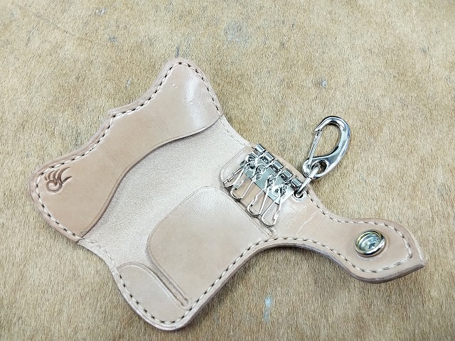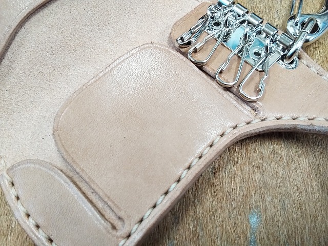 ナチュラルカラーのサドルレザーを使用し、曲線を組み合わせたシャープなカットのアウトラインで製作した、フラップタイプのキーケースです。