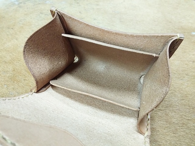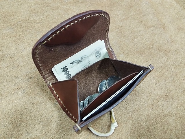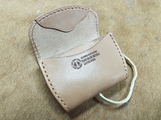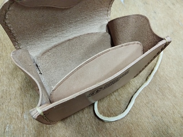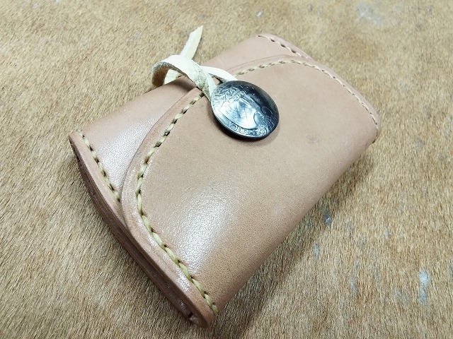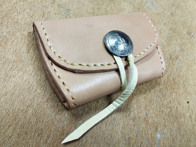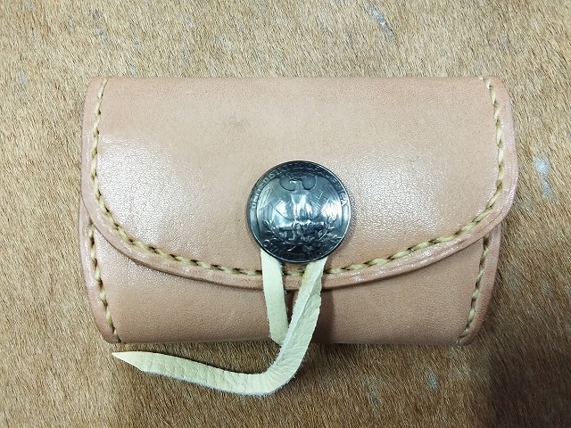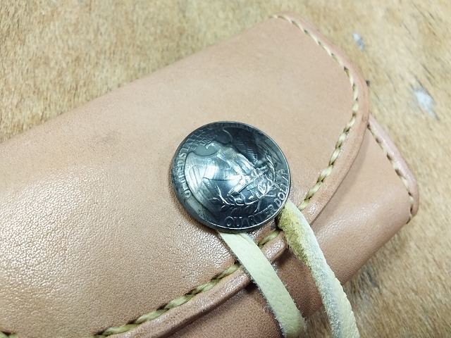 コンチョに25セントイーグルの白銅貨を使用して、ナチュラルカラーのサドルレザーで製作した、硬貨と一緒に、カード、折った紙幣等が収納できるコンチョにシカ革のレースをチョークして開きをロックするタイプのコインケースA2Cです。