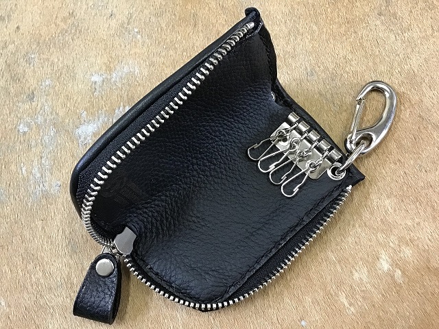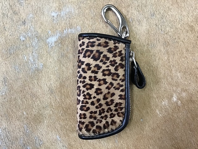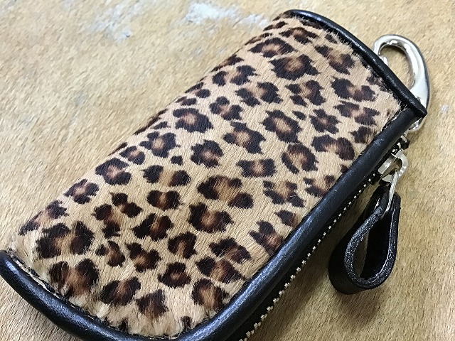 表面にヒョウ柄のプリント加工がされたヘアカーフ称される、生後6ヶ月以内の仔牛の毛付革を使用し、インナーにはシュリンクと称されるシボ(表面の凹凸感)が特徴的な黒の牛革を使用してフチにはパイピングワークを施し製作したL字ファスナータイプのキーケースです。